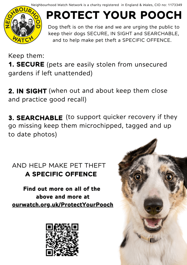 To help keep your dog safe Neighbourhood Watch Network have launched a PROTECT YOUR POOCH campaign highlighting simple and memorable things you can do to reduce your chance of becoming a victim of dog theft. www.ourwatch.org.uk/protectyourpooch